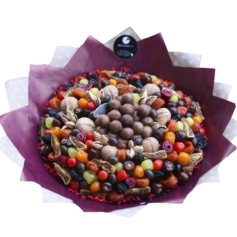 Состав: макадамия, пастила, инжир,курага,чернослив, финики,кумкват, грецкий орех,миндаль