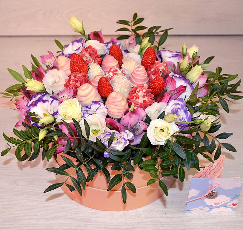 Состав: клубника в бельгийском шоколаде с сублимированной клубникой, клубника в бельгийском шоколаде с кокосовой стружкой, лизиантусы, альстромерия, зелень фисташки
