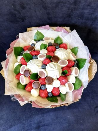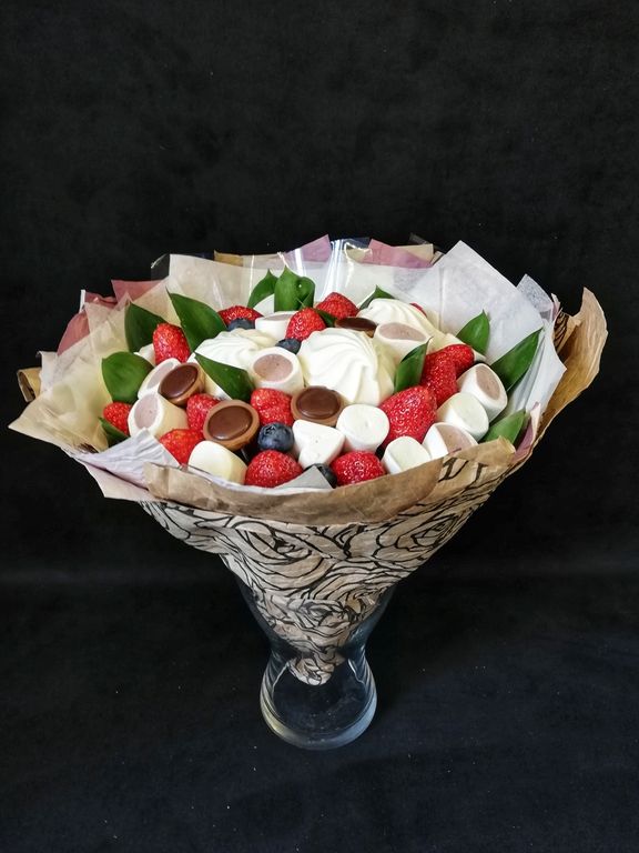 Состав: Зефир, маршмеллоу, шоколадные конфеты, клубника, голубика, зелень