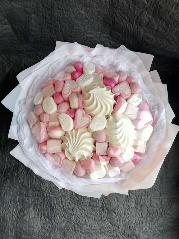 Состав: зефир, пастила, маршмеллоу, сливочные конфеты, фруктовый мармелад, драже