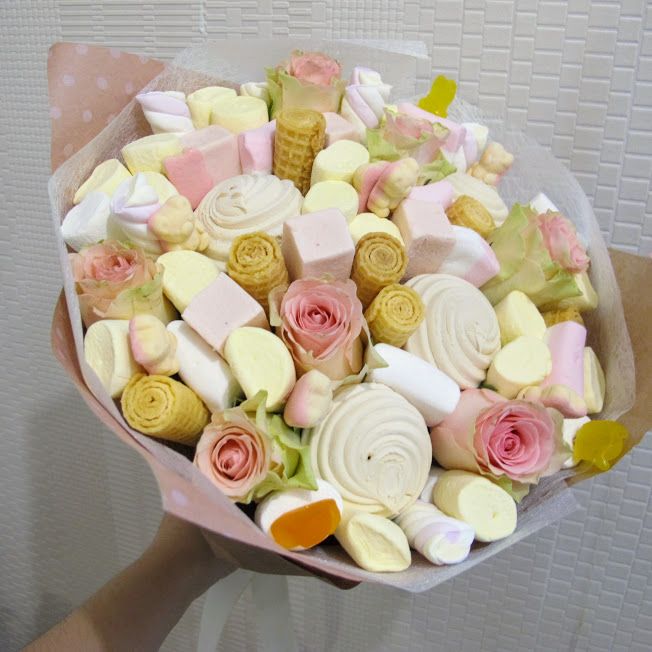 Состав: Зефир, пастила, вафельные рулетики, маршмеллоу, мармелад, роза, упаковка