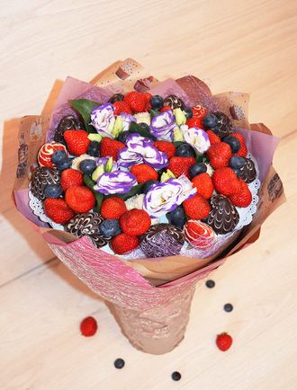 Состав: клубника, клубника в белом шоколаде с кокосовой стружкой, клубника в темном шоколаде с полосками из белого шоколада, голубика, лизиантусы
