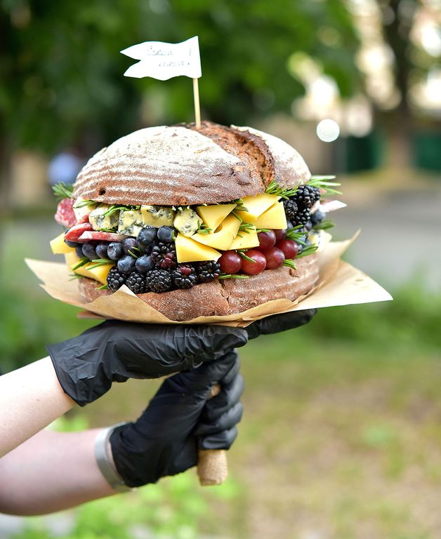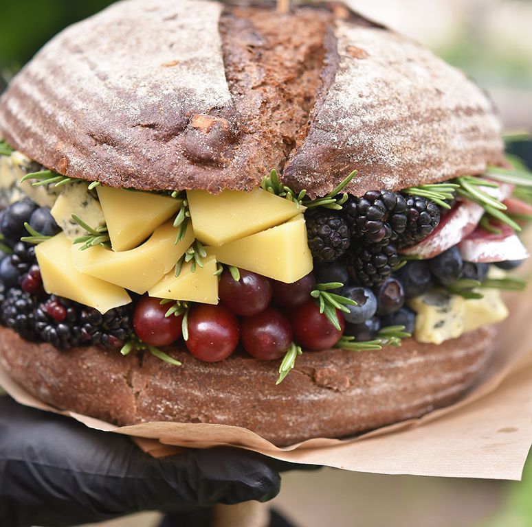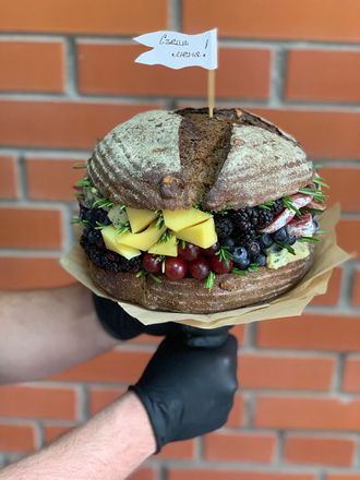 Состав: сыр Масдам, сыр Блю, ежевика, голубика, виноград, колбаса с белой плесенью, розмарин, хлеб ржаной