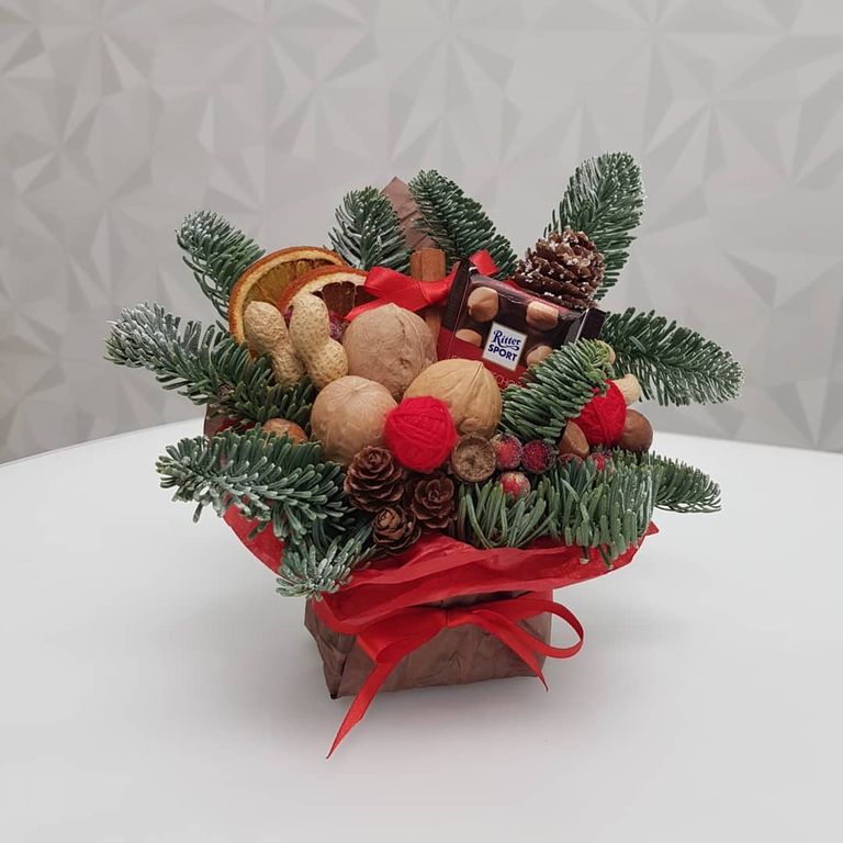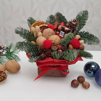 Состав: орехи, корица, шоколад Ritter Sport, сушеный апельсин, декор, шишки, нобилис.