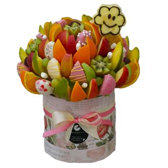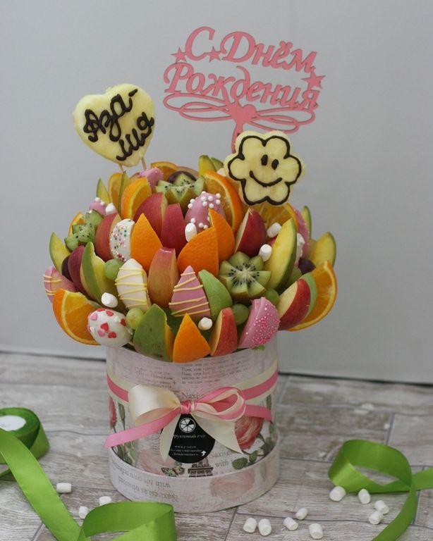 Состав: ананас,манго,яблоки,апельсины,клубника,киви,зефир,шоколад,цилиндр