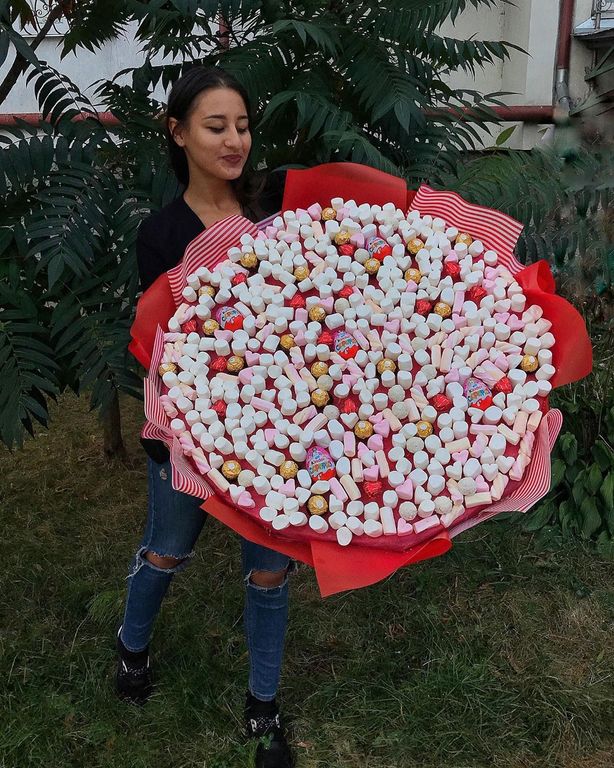 Состав: киндеры, шоколадные конфеты, зефир, маршмеллоу