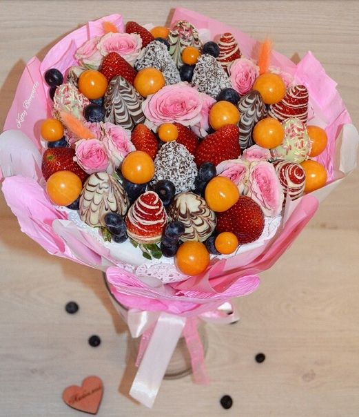 Состав: клубника, клубника в шоколаде, кокосовая стружка, кондитерская посыпка, голубика, физалис, кустовая роза