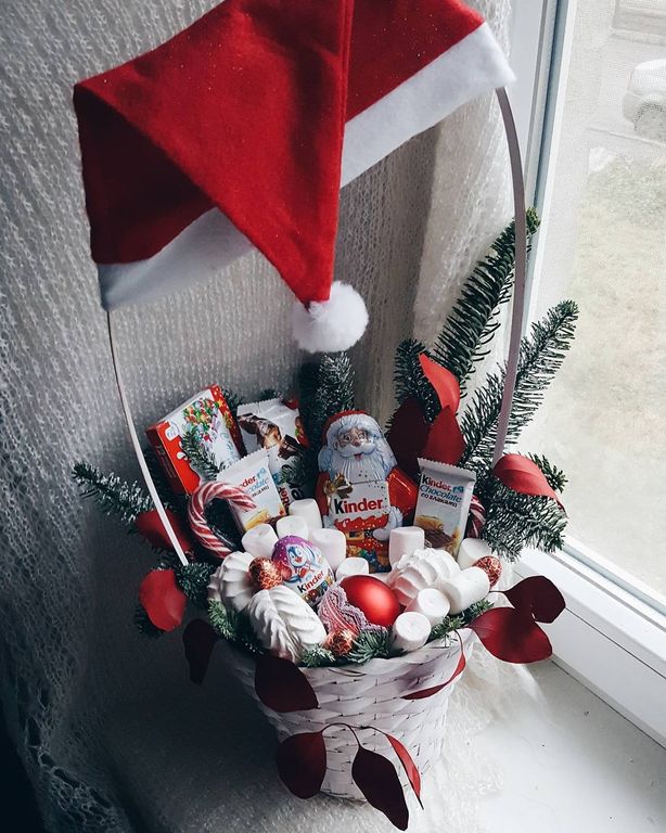 Состав: зефир, шоколадный дед мороз, шоколадки, маршмеллоу, новогодний декор