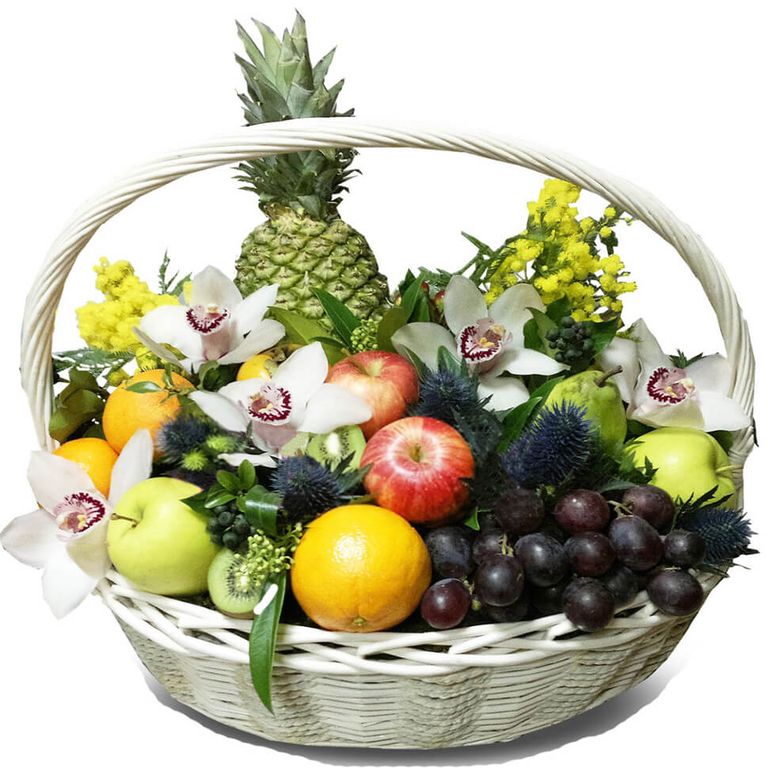 Состав: ананас, виноград, апельсины, яблоки зелёные, яблоки красные, груши, киви, оформление живыми цветами.