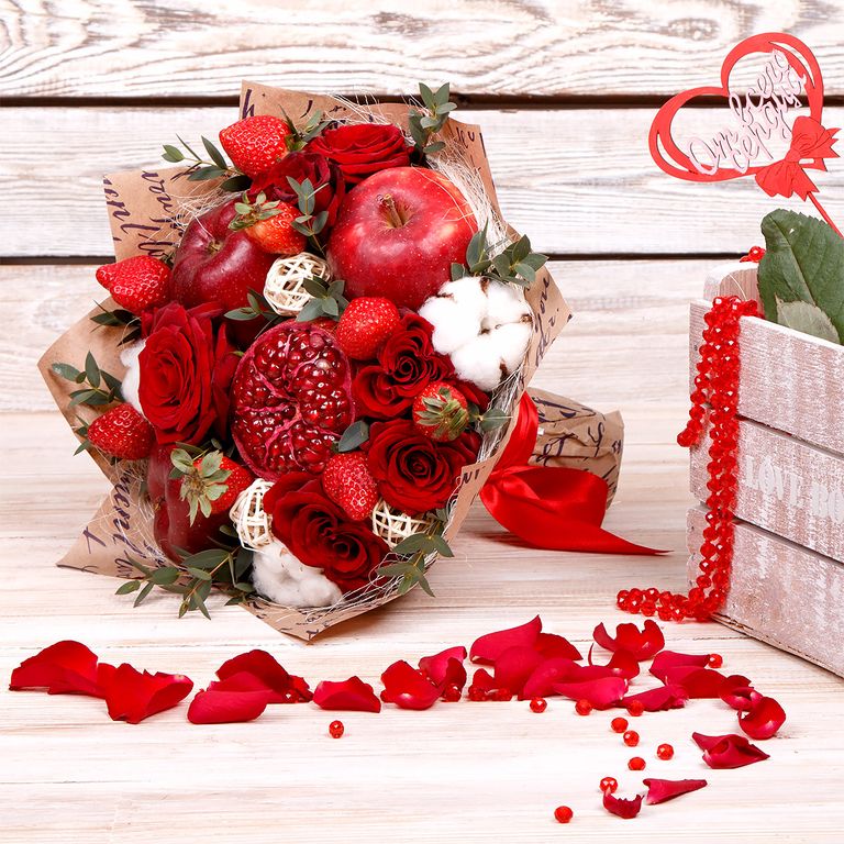 Состав: гранат, клубника (8 шт.), яблоки (3 шт.), 7 красных роз, зелень, хлопок, сизаль.