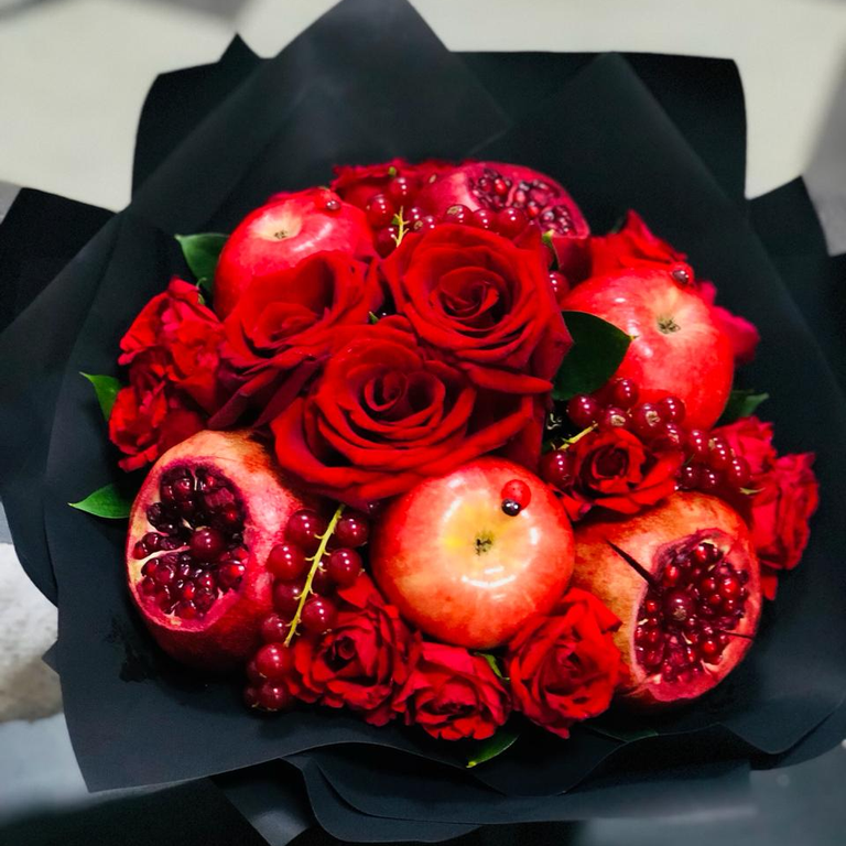 Состав: гранат, яблоки, розы, красная смородина, флористическая зелень